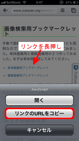 次に上のブックマークレットのリンクを長押しして、URLをコピーします。