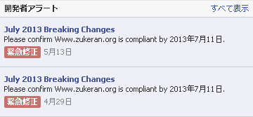 久しぶりに facebook developpersに入ったら、緊急修正!というメッセージが。なんじゃこれは。