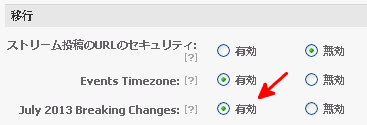 確認して問題なければメッセージに書かれているように 詳細設定 から、July 2013 Breaking Changes を有効にすれば警告は出なくなります。