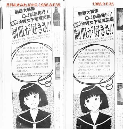 この連載も7回目になります。「沖縄女子高制服図鑑」についてはいくつか有力な情報もいただいているのだが、いまだに現物は確認できていません。今後も捜索を続けるつもりですが、この連載については、現在公開できる情報を記録して一区切りとします。もし新情報があれば続編という形で書く予定です。