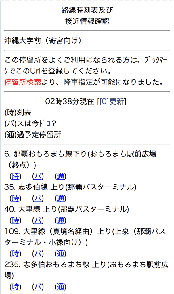 さて、沖縄大学前(寄宮向け)を選択すると下記のように表示されます。見慣れたバスナビの使いづらい画面です。
