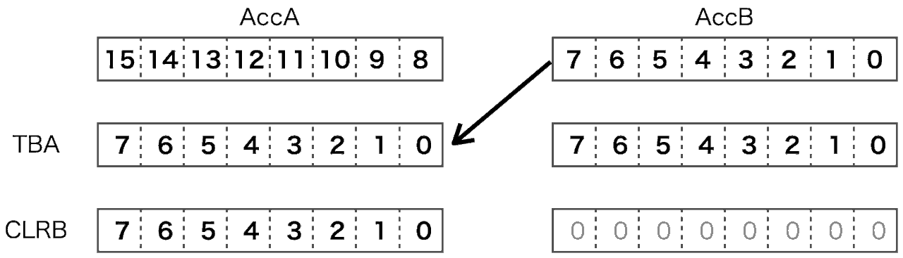 複数回の左右シフト操作を効率化したい。例えば、AccABを左に8bitシフトする場合は、TBAが使える。