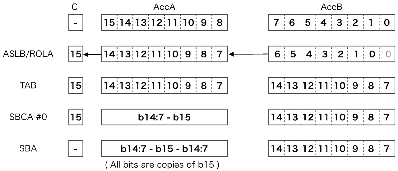 tab すると AccA == AccB なので、sba すれば 0 になる。負数のときに deca しておけば、AccAが$FFになる。