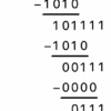 2進数のわりざんにはいろいろなやり方がある。B÷Dの形のわりざんをするのに、もっとも常識的なのは、符号を別に考えて,|B|÷|D|のわりざんを行って、商を求める方法である。しかしこれでは、次の例のように商および余りの符号をきめるのが厄介である。
