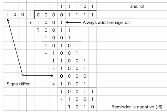 私の作り方だと除算ルーチンは無符号で作っておいて、2の補数の場合は符号を調整するための前処理・後処理を入れるようにしている。