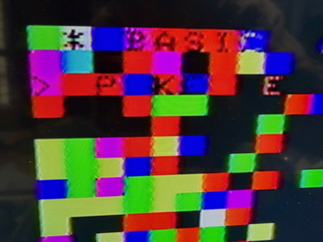 MP-1710は内部に1K*4bitのスタティックRAMである2114AP-2を2つ持っていて、計1KBの色情報を持っている。文字情報(768バイト)分しかないので、文字は1文字単位で色付けできるが、グラフィック表示の際は8×8ドット単位でしか色付けできない。文字しか表示できない機種を騙し騙し拡張しているので仕方がないではある。