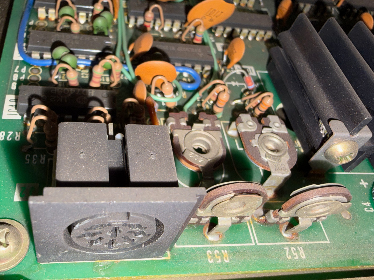 ビデオ信号出力用コネクタと調整用の半固定抵抗(R52,R53)。R52は映像位置(VIDEO)、R53は水平位置(H.P)。内部のR50は「ウィンドウ後調整」、R51は「ウィンドウ前調整」。