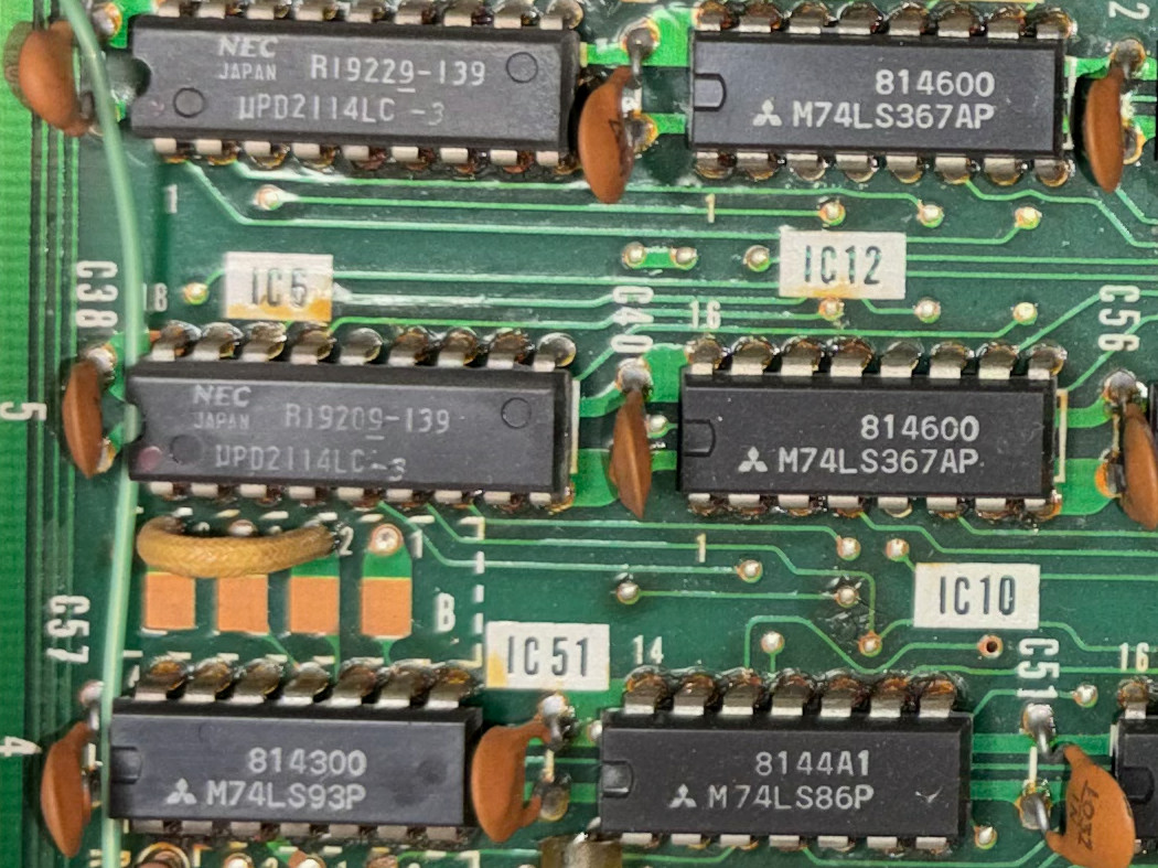 色情報を保持するスタティックRAMは、NEC μPD2114LC-3(1Kx4bit)が2つ。速度を示す -3 が手書きっぽい?