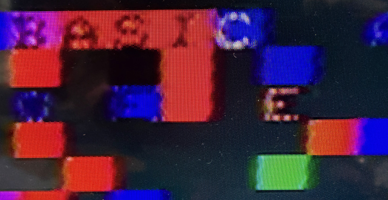 テストのために、POKE $E892,1 を実行してみます。色情報を初期化していないので、ランダムに色が付きます。