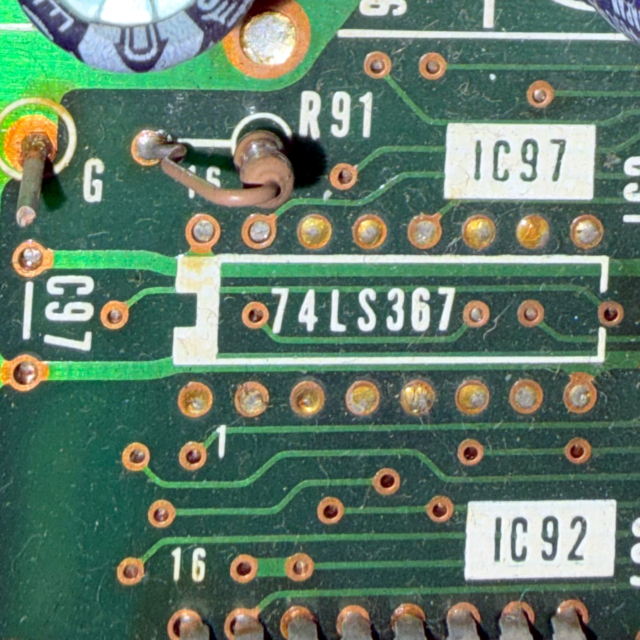 DMA-IC部分(IC97〜IC99_は基板上に74LS367と書かれている。当時よく使われていた3ステートバッファだ。
