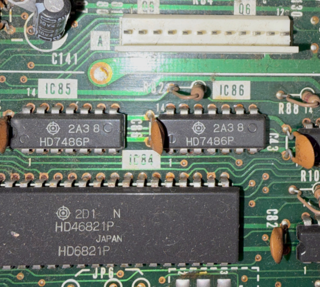 Jr.のセントロニクス端子へは、HD46821P PIA (MC6821相当)のBポートからHD7486Pを経由して接続されている。7486PはXORだが、片側をGNDに落として単なるバッファとして使われている。理由はわからない。もしかして、片側をVCCに繋いで負論理にする可能性があったのだろうか?