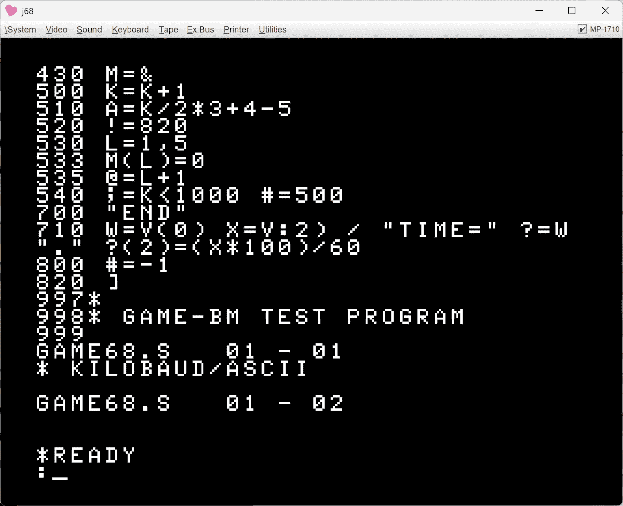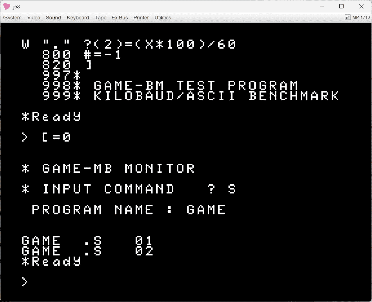 GAME言語のBASICMASTER移植版。 [=0 で独自モニタに飛び、そこでSAVEする。