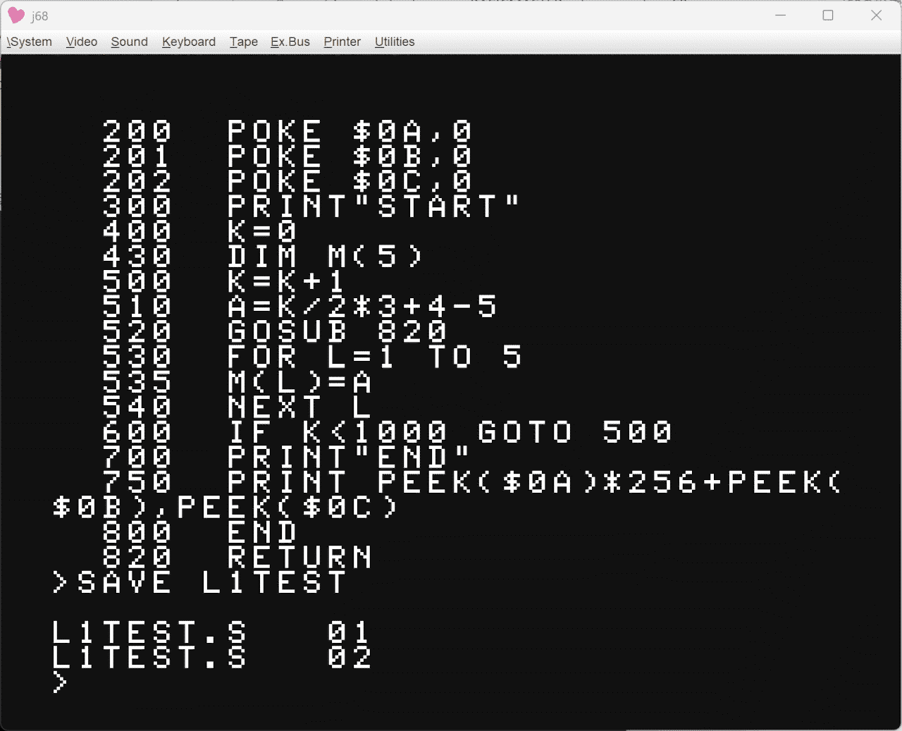 0000: ff ff ff ff ff ff ff ff ff ff ff ff ff ff ff ff ................ 0010: ff ff ff ff ff ff ff ff ff ff ff ff ff ff ff ff ................ 0020: ff ff ff ff ff ff ff ff ff ff ff ff ff ff ff ff ................ 0030: ff ff ff ff ff ff ff ff ff ff ff ff ff ff ff ff ................ 0040: ff 01 10 00 4c 31 54 45 53 54 2e 53 01 00 05 c0 ....L1TEST.S.... 0050: ec 00 c8 0c 20 50 4f 4b 45 20 24 30 41 2c 30 0d .... POKE $0A,0. 0060: 00 c9 0c 20 50 4f 4b 45 20 24 30 42 2c 30 0d 00 ... POKE $0B,0.. 0070: ca 0c 20 50 4f 4b 45 20 24 30 43 2c 30 0d 01 2c .. POKE $0C,0.., 0080: 0e 20 50 52 49 4e 54 22 53 54 41 52 54 22 0d 01 . PRINT"START".. 0090: 90 05 20 4b 3d 30 0d 01 ae 0a 20 44 49 4d 20 4d .. K=0.... DIM M 00a0: 28 35 29 0d 01 f4 07 20 4b 3d 4b 2b 31 0d 01 fe (5).... K=K+1... 00b0: 0d 20 41 3d 4b 2f 32 2a 33 2b 34 2d 35 0d 02 08 . A=K/2*3+4-5... 00c0: 0b 20 47 4f 53 55 42 20 38 32 30 0d 02 12 0e 20 . GOSUB 820.... 00d0: 46 4f 52 20 4c 3d 31 20 54 4f 20 35 0d 02 17 08 FOR L=1 TO 5.... 00e0: 20 4d 28 4c 29 3d 41 0d 02 1c 08 20 4e 45 58 54 M(L)=A.... NEXT 00f0: 20 4c 0d 02 58 14 20 49 46 20 4b 3c 31 30 30 30 L..X. IF K<1000 0100: 20 47 4f 54 4f 20 35 30 30 0d 02 bc 0c 20 50 52 GOTO 500.... PR 0110: 49 4e 54 22 45 4e 44 22 0d 02 ee 29 20 50 52 49 INT"END"...) PRI 0120: 4e 54 20 50 45 45 4b 28 24 30 41 29 2a 32 35 36 NT PEEK($0A)*256 0130: 2b 50 45 45 4b 28 24 30 42 29 2c 50 45 45 4b 28 +PEEK($0B),PEEK( 0140: 24 30 43 29 0d 03 20 05 20 45 4e 44 0d 03 34 08 $0C).. . END..4. 0150: 20 12 00 ff ff ff ff ff ff ff ff ff ff ff ff ff ............... 0160: ff ff ff ff ff ff ff ff ff ff ff ff ff ff ff ff ................ 0170: ff ff ff ff ff ff ff ff ff ff ff ff ff ff ff ff ................ 0180: ff ff ff ff ff ff ff ff ff ff ff ff ff ff ff ff ................ 0190: ff ff ff ff 01 10 00 4c 31 54 45 53 54 2e 53 02 .......L1TEST.S. 01a0: 0f 06 c0 db 52 45 54 55 52 4e 0d ff ff 04 45 4e ....RETURN....EN 01b0: 44 0d ff 2e 00 ff ff ff ff ff ff ff ff ff ff ff D............... 01c0: ff ff ff ff ff ff ff ff ff ff ff ff ff ff ff ff ................ 01d0: ff ff ff ff ff ff ff ff ff ff ff ff ff ff ff ff ................ 01e0: ff ff ff ff ff ff ff ff ff ff ff ff ff ff ff ff ................ 01f0: ff ff ff ff ff ff 01 00 00 4c 31 54 45 53 54 2e .........L1TEST. 0200: 53 02 01 05 c0 fa 00 00 00 S........