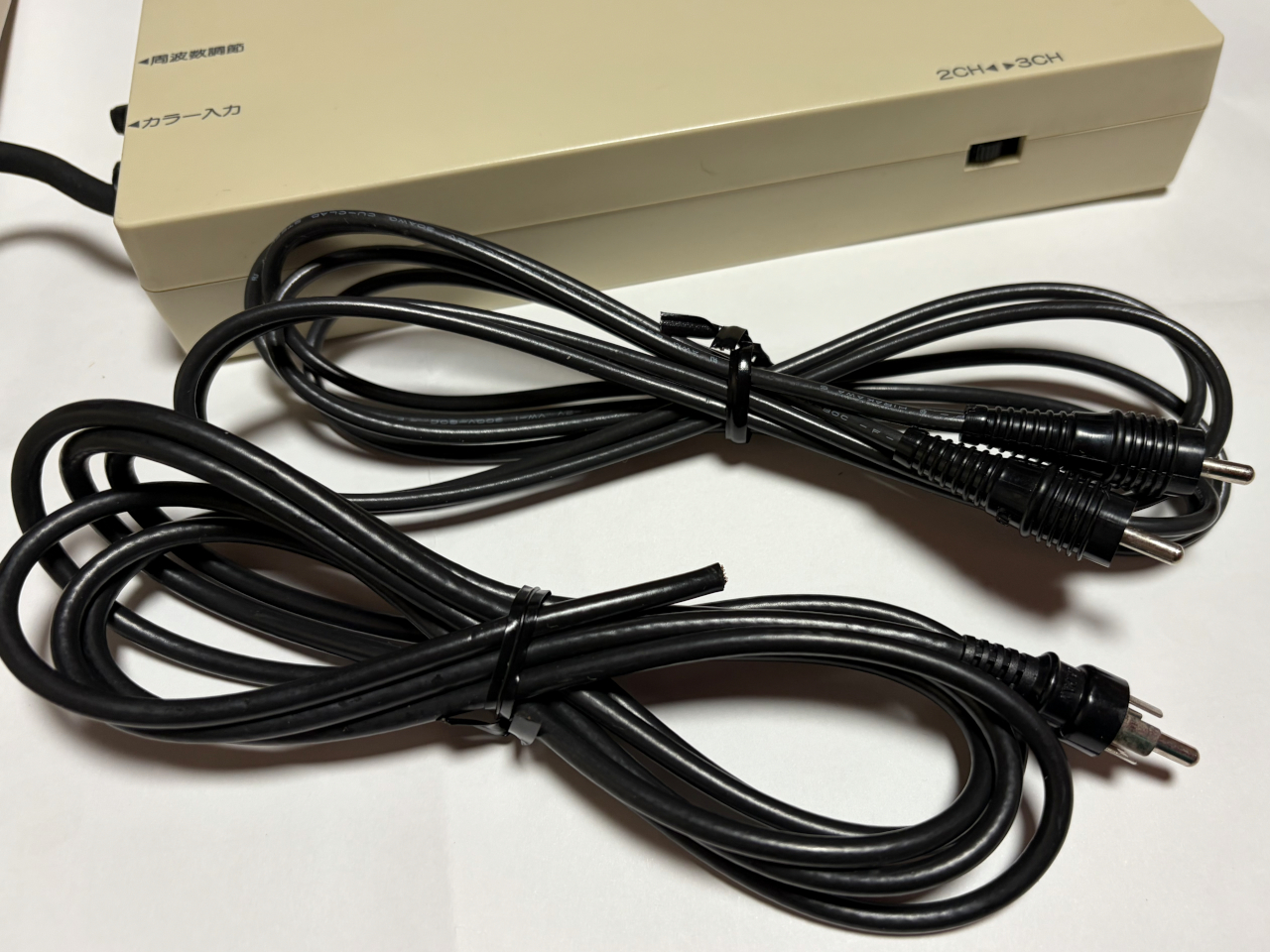 ケーブルはRCA-RCAが1本、 片端がRCAで他方はぶつ切りされているケーブルが1本。後者はテレビのアンテナ端子に繋ぐためでしょう。昔のTVはF型コネクタすら無かったもんな。