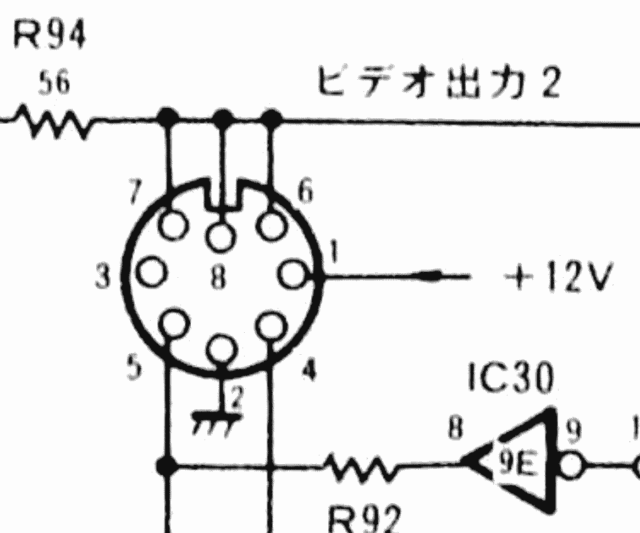 ベーシックマスターJr.(BM-6885)本体と、カラーアダプターMP-1710には、DIN 8ピンのビデオ出力端子があります。